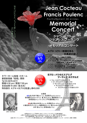 Aプロ:コクトー映画を彩る古典派の装い ・向井千絵、古宮朋子、岩田慶子、星光、島根朋史、赤塚由紀、戸村真寿美 Bプロ:パリのエスプリ プーランク カクテルズ ・高山みゆき、木原聡子、小島佐和子、島根朋史、原ひふみ、井出諒、赤塚由紀 18:30開場 19:00開演 全自由席¥1,800(各日共) 特別割引 Aプロ+Bプロ夜通し券¥3,000 お問合わせチケットご予約お申込み:ジャンコクトーフェスティバル実行委員会 重杉 TEL:090-9147-0439 jeune-cosmos@kzh.biglobe.ne.jp