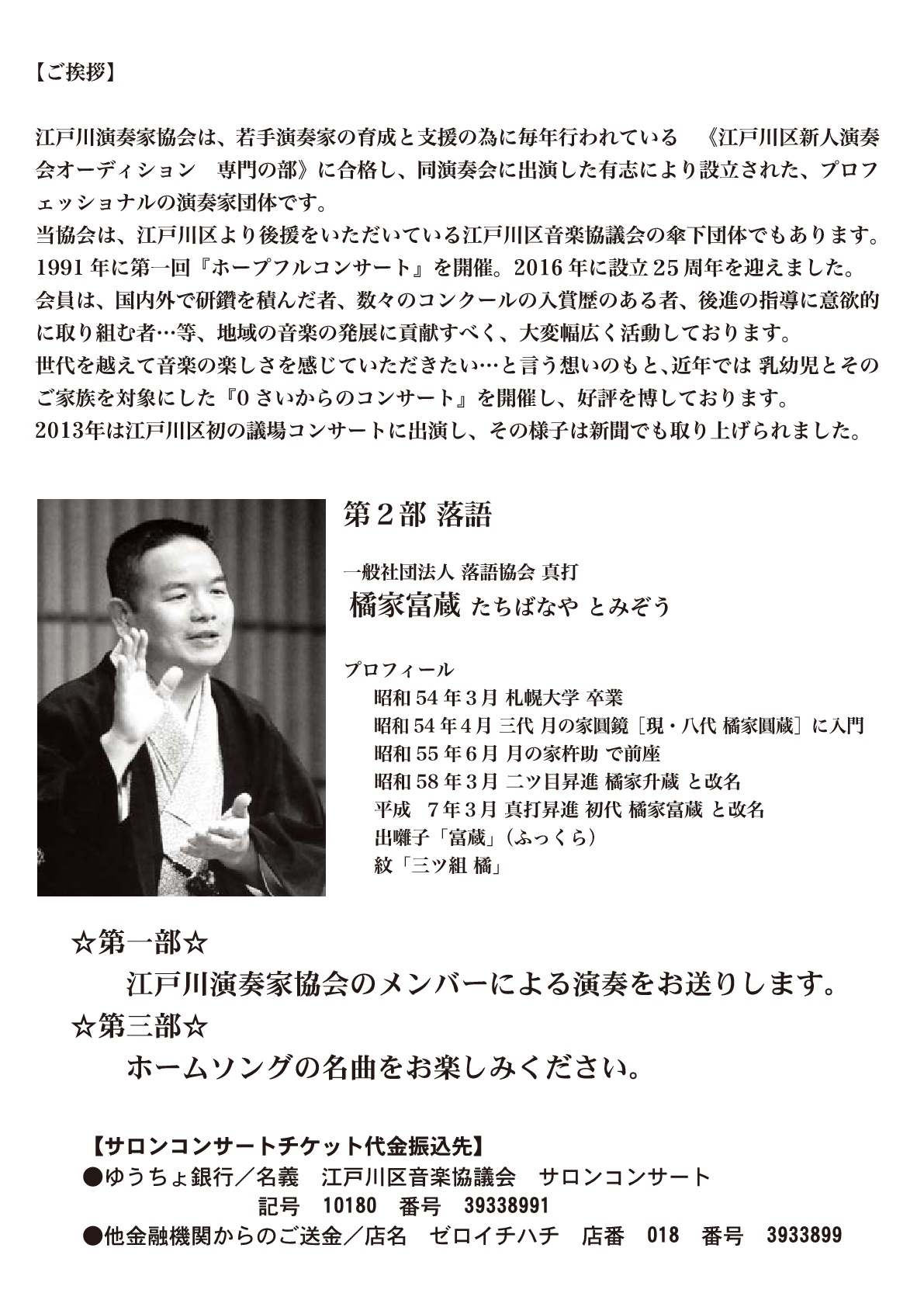 主催 江戸川区音楽協議会 共催 江戸川演奏家協会 後援 江戸川区 お問い合せ 演奏家協会事務局 080(6776)1795 edogawa.music.1991@ezweb.ne.jp チケットの予約はこちらから タワーホール船堀でもチケットをお求め頂けます。℡03(5676)2211